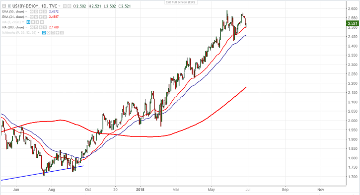 German-U.S. yield spread: The yield spread has been widening since February of this year, from a low of 1.96 bps in February 5 to 2.50 bps as of June 28, reaching its highest on May 28 and then witnessing a decline again.