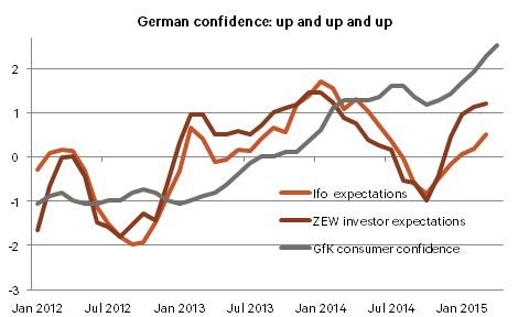 - IFO optimism is highest since July 2014. Business managers are extremely optimistic for more orders and increased level of production in the coming quarters.