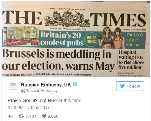 Russia has seized this opportunity and hit back at allegations of election meddling against itself. The Russian embassy in London mocked May’s allegations by tweeting: ‘Praise God it’s not Russia this time’ next to a picture of the front page splash on Thursday’s Times that says “Brussels is meddling in our election, warns May”. Russia has been accused by western leaders as well as the media of meddling in the US and other European election.