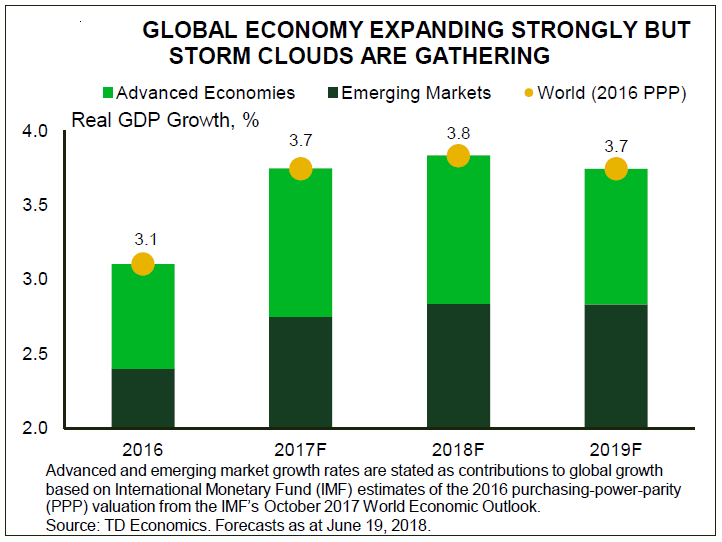 Global growth is expected to run at a robust 3.8 percent this year, similar to last year. However, this steady performance hides a weaker-than-expected start in the Euro Area and the UK, which can be partly chalked up to temporary factors, according to a recent research report from TD Economics.
