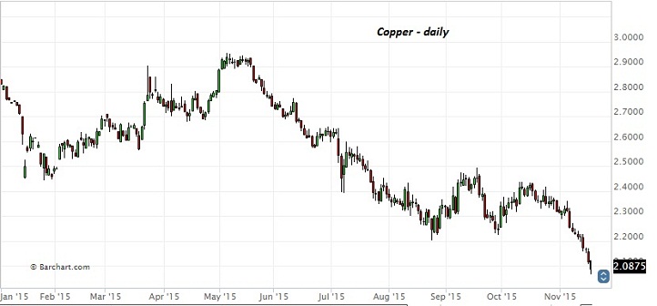 Copper is currently trading at $2.08/pound, down for 10 consecutive days and in this period it has declined close to 11%. Since May this year, decline has actually gathered pace, as price has declined close to 30%.