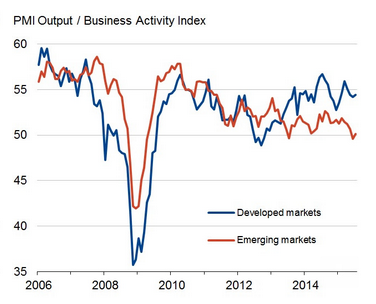 Global economic growth picked up slightly for the first time in four months in July. The JPMorgan Global PMI rose from 53.1 to 53.4 in July to signal a rate of global GDP growth of just over 2% per annum. A marked divergence was once again evident however, with robust expansion in the developed world contrasting with stagnation in the emerging markets.