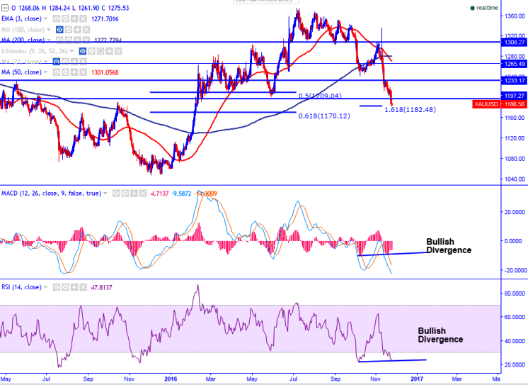 - The yellow metal‘s overall trend is weak but the MACD and RSI in the daily chart is showing Bullish divergence. So, slight jump till $1200 is possible.