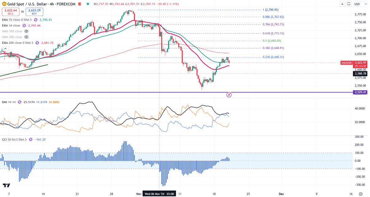 Currently, gold prices are situated above both short-term and long-term moving averages on the 4-hour chart, indicating a bearish trend. Immediate support appears at $2,600; if prices fall below this level, they could target further declines to $2,580, $2,560, $2,535, $2,500, and possibly $2,470. On the upside, minor resistance is noted at $2,640 (23.6% fib); breaking through this barrier could lead to upward movement toward $2,665, or even $2,700. Given the bearish indicators, a strategy of buying on dips around $2,578-$2,580 is recommended, with a stop-loss set at $2,550 and a target price of $2,700.