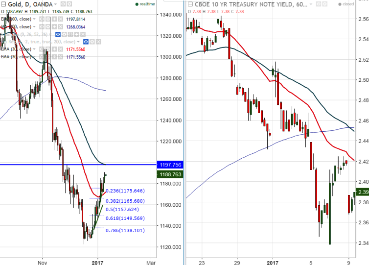 - The yellow metal has broken the high made on Dec 5th 2016 and jumped slightly till $1190.70 level. It is currently trading around $1188.Gold is trading well above short term resistance 30-day EMA and a slight jump till $1198 (60- day EMA).