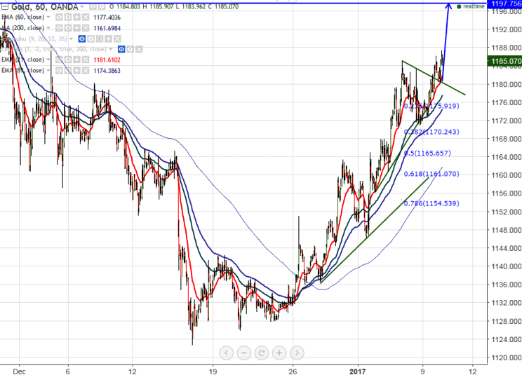 - The yellow metal has made a low of $1170 and recovered sharply from that level. It is currently trading around $1185.Gold has taken support near 60- H EMA and any small weakness can be seen only below that level.