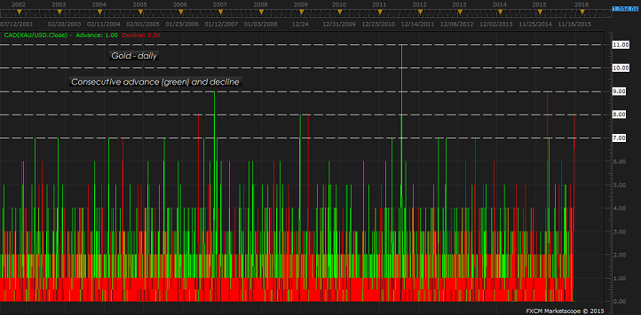In past decade Gold has declined only three times for eight consecutive days and once for nine consecutive days. In March this year, gold declined for 9 consecutive days and other two back in 2006 and 2009.