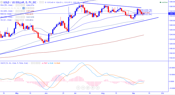 - Gold is facing major intraday resistance around $1332 (21- day MA) and any break above targets $1345 (61.8% retracement of $1352.61 and $1335)/$1352.