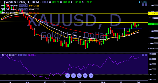 We prefer to take long position on XAU/USD around $1120, stop loss $1108 and target $1132 levels.