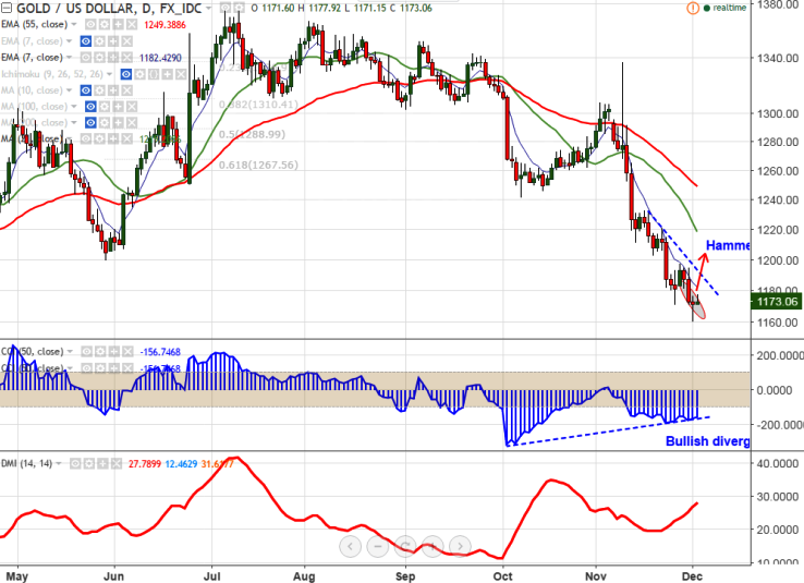 - In the daily chart gold has formed bullish divergence and hammer pattern. So a slight jump till $1185 cannot be ruled out.