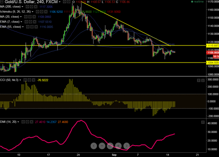 - Gold has broken major support $1115 and declined till $1101. It is currently trading at $1107. Overall trend is still bullish as long as support $1120 holds.