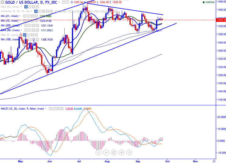 - The yellow metal is trading in a narrow range between $1332 and $ in the short term. Markets awaiting the US presidential debate between Republican Donald Trump and Democrat Hillary Clinton on Tuesday at 01:00 GMT for further direction.