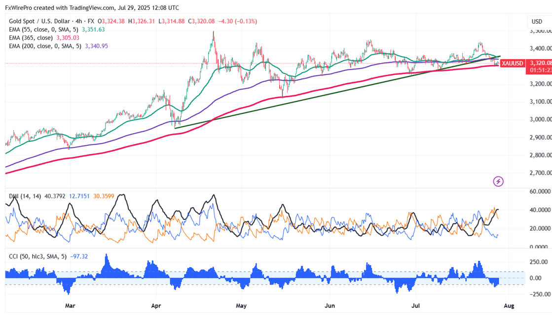 Gold prices are holding below short-term moving averages, 34 EMA and 55 EMA, and above the long-term moving averages (200 EMA) on the 4-hour chart. Immediate support is at $330,0 and a break below this level will drag the yellow metal to $3290/$3275/$3245/$3200. The near-term resistance is at $3330 with potential price targets at $3345/$3360/$3385/$3400/$3420/$3450/$3475/$3500/$3550.