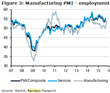 "While the strong upside surprise is potentially welcome news for the outlook of the UK's manufacturing industry, it has not been felt across all sectors. Of concern is that this upside surprise is confined solely to large firms, according to the Markit press release, while SMEs (accounting for approximately 50% of UK GVA) reported similar levels to September or even marginal declines", says Barclays.