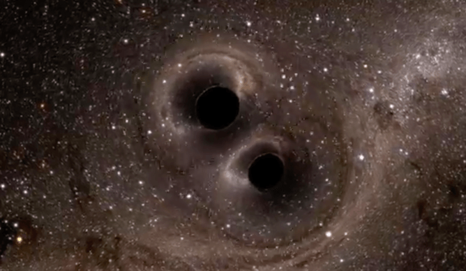 What a glimpse it was. The two black holes that collided were respectively about 29 times and 36 times the mass of our sun (shown in the computer visualisation below). It is incidentally the first direct evidence that black holes exist, can exist in a pair, and can collide and merge. Comparing our data with Einstein’s predictions allowed us to test whether general relativity correctly describes such a collision – they passed with flying colours.