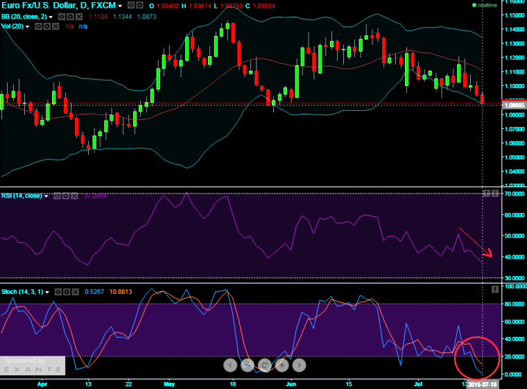 EURUSD case is exactly opposite to what we explained of USDCAD pair earlier. Here, we traced out bearish sensation is continuing as the %D line crossover on slow stochastic arrives below 20 levels while RSI (14) converges the price dips. The pair has opened today by breaking strong support at 1.0935 levels. We can see next strong support only at 1.0807 levels.