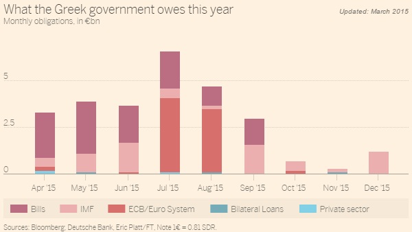 This fantastic chart from financial times above, explains Greece's liabilities this year towards IMF, ECB, bill refinancing, bilateral loans and private sector.