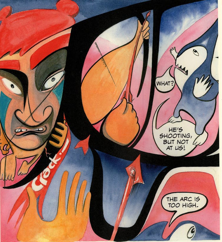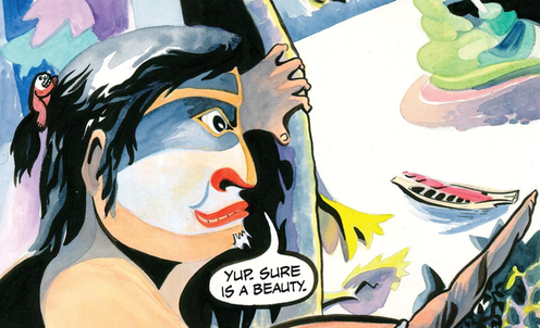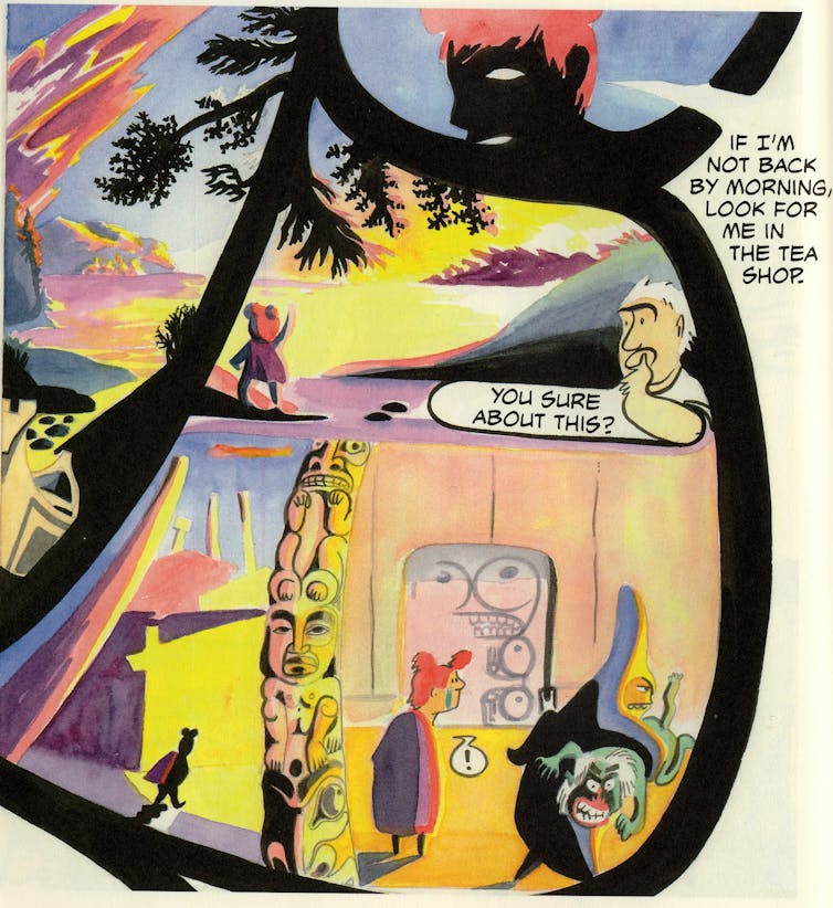Yahgulanaas takes his experimentation and genre mixing to a new level, using curved formlines as outlines for his panels. This means that, according to the conventions of Pacific Northwest coastal art, the negative spaces created by the figurative black lines become positive spaces where the action takes place and the characters move.