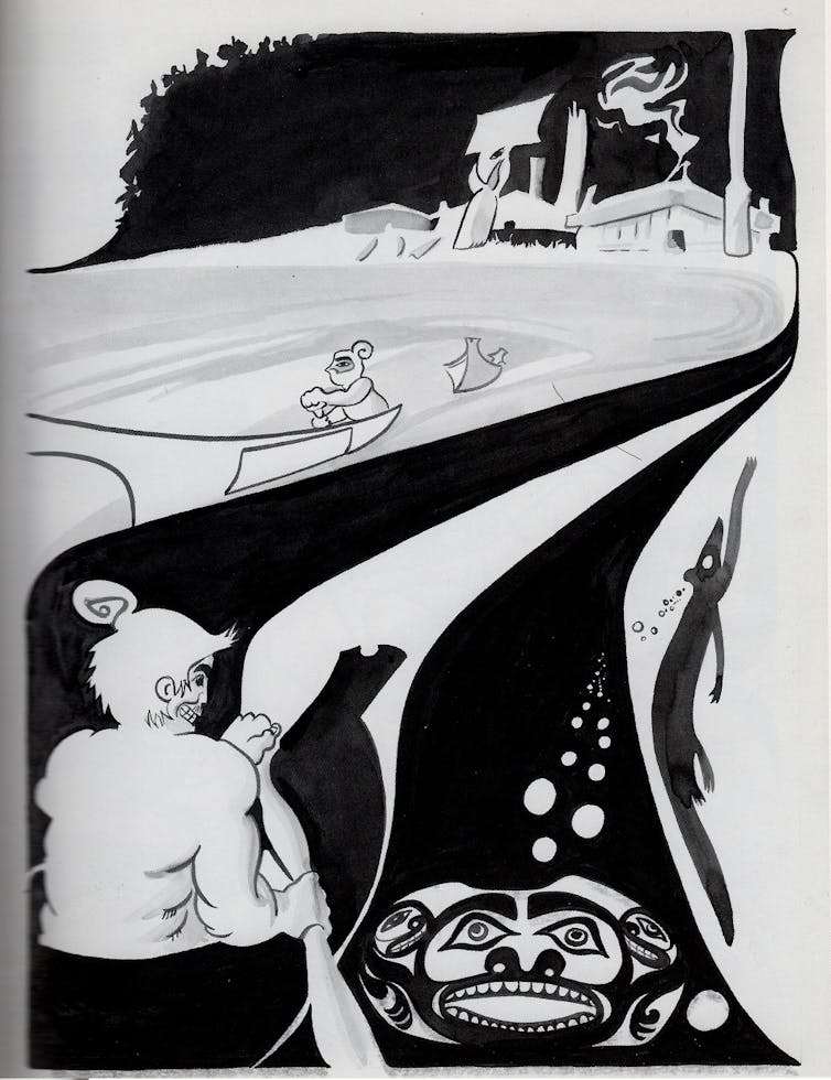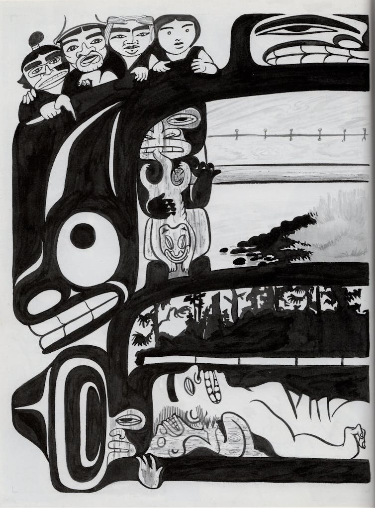 Rather, it serves as a kind of visual metaphor or dialectic tool to juxtapose a Haida vision of the world with Western ways of seeing, when it comes to space-time, or the connections between the people in it and their relationship to the environment.