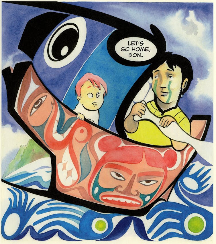 When the mural is reconstructed, you can see a stylized image of a supernatural entity, or Haida motif (an animal figure, ancestor or social group). This stylized image is in line with canonical two-dimensional art from the Pacific Northwest coast — although bearing no relation to the plot — links all the panels and pages of the book.