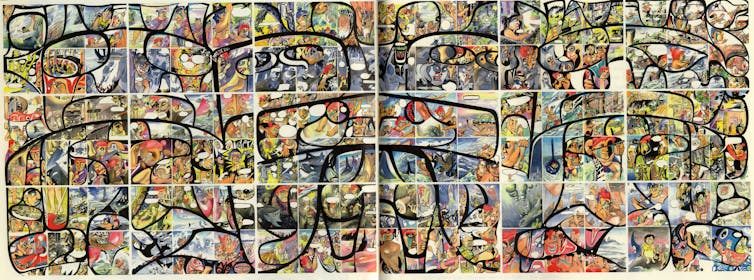 Yahgulanaas’ artistic approach goes against the grain of the Western comic tradition, with its white frames where space becomes time, structuring the narrative in a way that, for him, does not suit the Haida way of thinking.