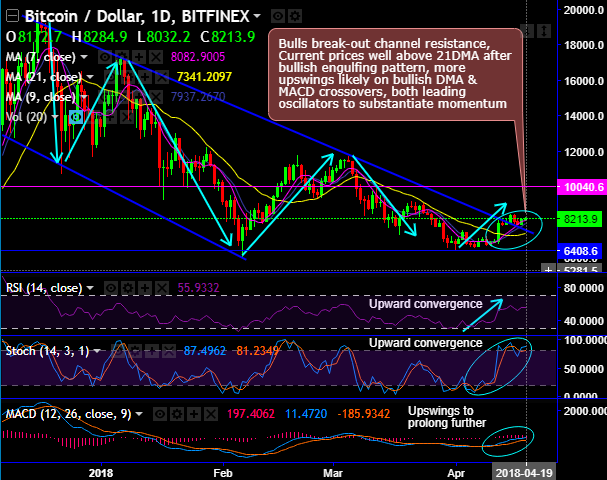 With reference to our previous write-up, we could foresee the stiff resistance at $8,388 levels (i.e. 55EMAs). Hence, one can wait until a decisive breach of these levels, however, an aggressive BTC bull can prefer CME BTC futures contracts for May month delivery which is trading +15 rather than the spot BTCs.