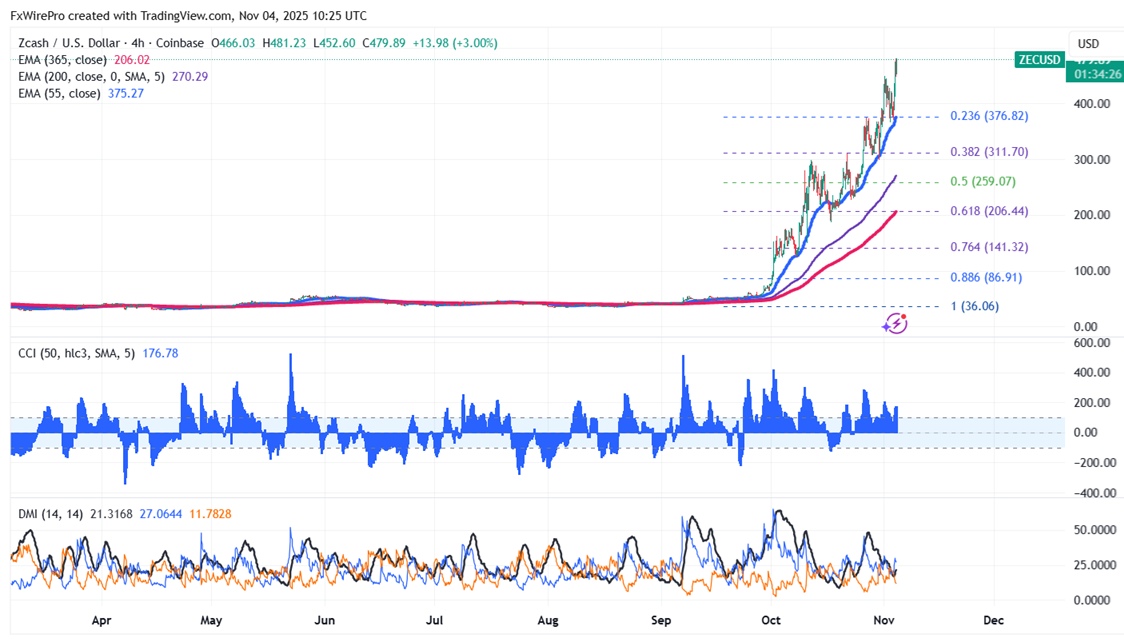 ZECUSD gained more than 900% in the past two months. The pair holds above the short-term (34 and 55 EMA) and the long-term moving average in the 4-hour chart. It hit an fresh all-time high of $481.23 and is currently trading around $479.58.