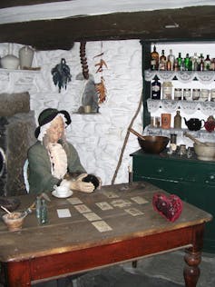 A model of a 19th-century cunning woman in her house, at the Museum of Witchcraft, Boscastle in England. CC BY