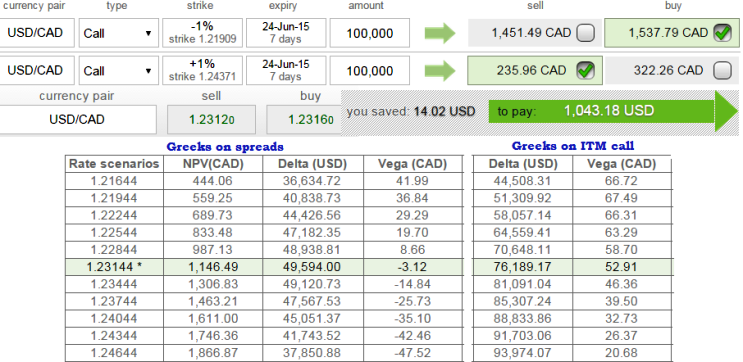 On long side current (1%) ITM delta calls indicate 0.76 and vega at 52.96, which signifies any implied volatility disrupts current bullish mood option premiums would be effected at CAD 52.96 for corresponding change in IV.