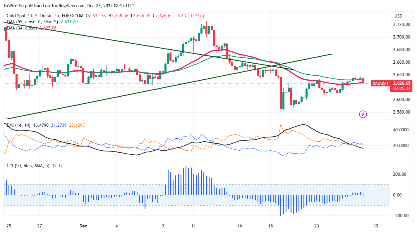 Gold prices are flat despite strong U.S. Treasury yields, largely due to the holiday season. Recently, they peaked at $2,639 but are currently trading around $2,627.57.