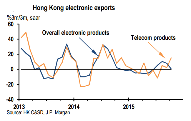 Hong Kong's total exports rose 1.1%m/m, sa in October, leaving total exports down 3.7%oya. Meanwhile imports slipped 0.1%m/m, sa, falling 8.5%oya in October. As a result, the trade deficit narrowed to HK$29.6 billion in October from HK35.2.1 billion in September. Exports of telecom products surged 8.8%m/m, sa in October while overall electronics only gained 0.3%, hinting that the tech cycle may still be alive, but narrowly based around the new mobile phone launches in 3Q.