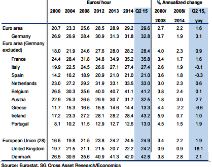 "Overall, the tax rebate to firms totalled €12bn in 2014 (on 2013 compensation) and €20bn in 2015. In 2015, the CICE impact seems to have waned as hourly labour costs (both wage and non-wage costs) held firm, raising questions over the efficiency of the government's 'Responsibility' pact which is aimed at slashing labour costs and boosting business competitiveness", says Societe Generale.