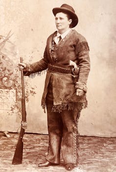 Calamity Jane wearing homesteader gear: Indigenous-influenced buckskins, with an ivory-gripped Colt Army revolver tucked in her hand-tooled holster, holding a rifle. (C.E. Finn/Cowan's Auctions/PD-US)