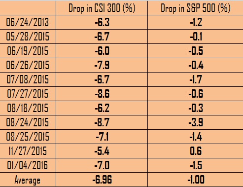 Since 2013 (excluding today's move) Chinese stock market has plummeted more than 5% on 11 occasions, averaging about 6.96% drop and average move in S&P 500 on those occasions has been merely a percent, with stock rising in only one occasions.
