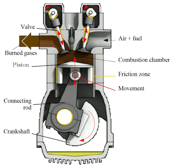 Diagram of a combustion engine: movement of parts (red) and friction areas (yellow). Zephyris/Wikimedia/TCF, CC BY
