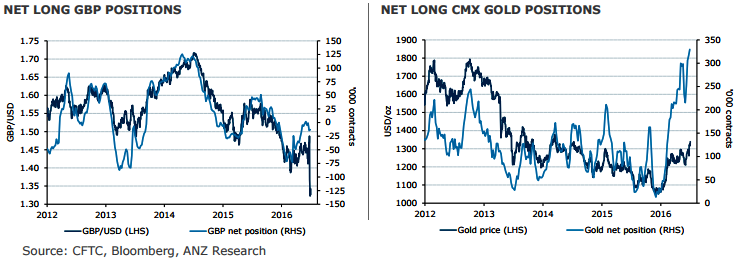 Brexit volatility saw funds turning to safe haven assets like gold. Net long contracts in gold rose to 329,800 this week, the highest in CFTC data history (see above graph).