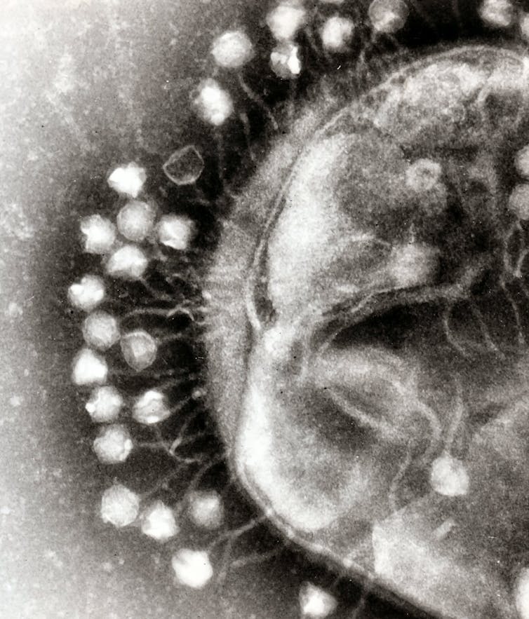 Electron micrograph image of bacteriophages attached to a bacterial cell. Dr Graham Beards/wikipedia, CC BY-SA