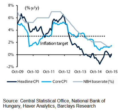 Hungary's October inflation rose to 0.1%, from September's -0.4%. Increase in food inflation to 1.5% yoy from last month's 0.4%, from base effects unseasonal monthly declines in food prices in last October.