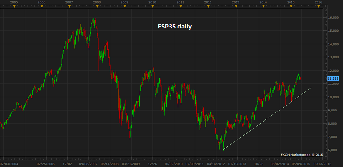 Spanish benchmark stock index IBEX (ESP35) is currently trading around 11380 level, far from its pre 2008 crisis high.