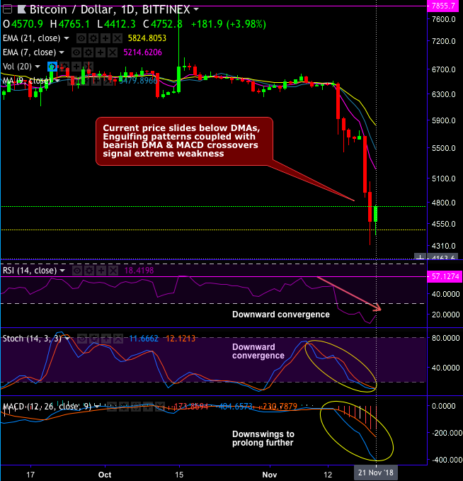As flurry of bearish streaks in cryptocurrencies has halted for today, but earlier BTCUSD tumbled to fresh 13-month lows at $4,303.50, while ETHUSD showed slumps upto $126.20 levels as the bearish momentum is intensified in both trends (as shown in the above technical charts), prolonging a continuous selloff that wiped-off almost $71 billion off the collective market cap.
