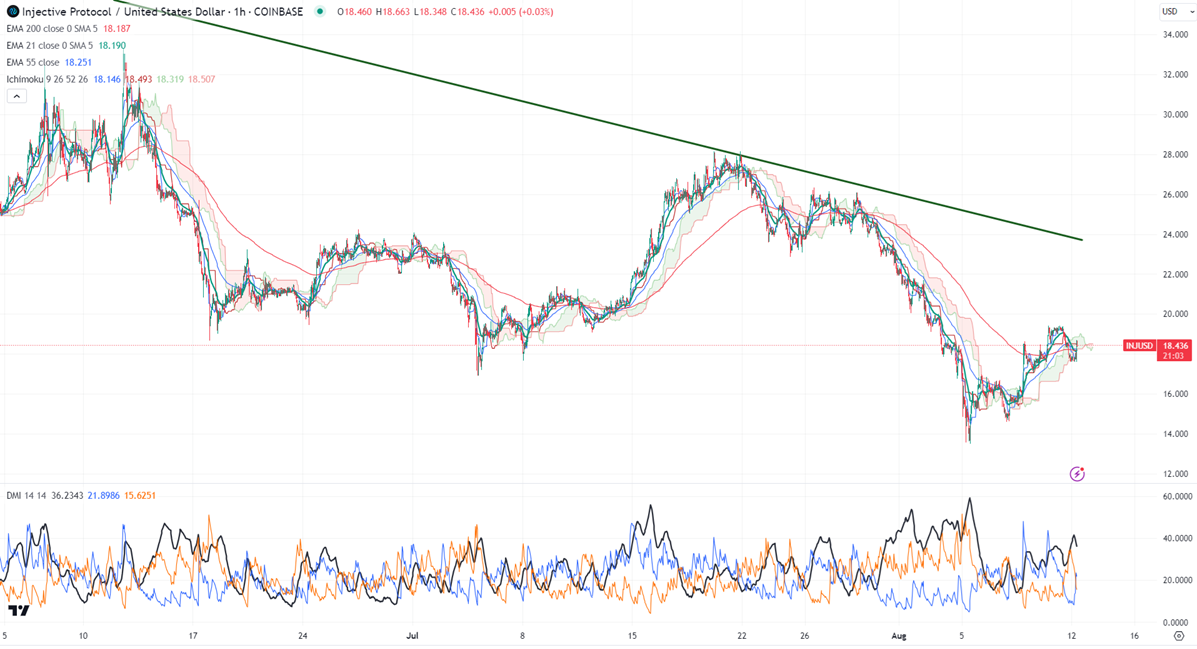 INJUSD shown a minor pullback after a massive sell-off. It has surged more than 40%. It hit a high of $19.42 and currently trading around $18.57. The pair is holding above the short-term (21 and 55-day EMA) and long-term moving average (200-day EMA).