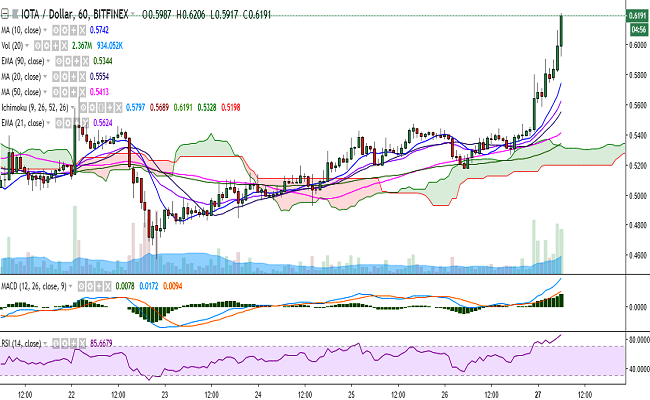 IOT/USD is trading higher on Monday at 0.6208 levels at the time of writing, continuing its uptrend from late last week (Bitfinex). On the upside, next key resistance is seen at 0.7000 (4h 200-SMA)/0.7931 (50-DMA). On the flipside, a break below 0.59 (21-EMA) would drag the pair to 0.5501 (5-DMA)/0.5277 (10-DMA).