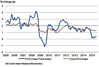 "Given the most recent declines in retail energy costs, the gap between the annual growth rates of the total and core PCE inflation gauges since last fall that likely will continue over the months ahead and may not close until the second half of 2016", added Societe Generale.