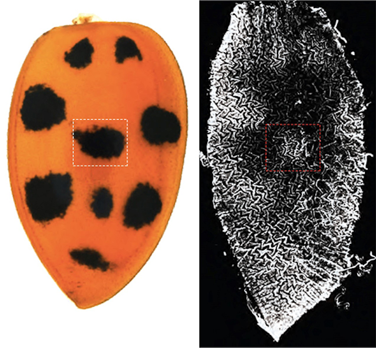 The location of the protein in different cellular territories of an elytra is correlated with the spatial distribution of the black pigmentation. The gene pannier is activated (or expressed) in different cellular territories (right photo, silver areas) that prefigure the locations of black spots on the red elytra (left photo). Author provided, Author provided