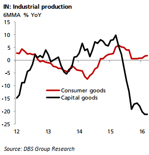 On the use-based end, capital goods extended decline at -26 percent y/y, from -24 percent in Q3, while consumer goods production was a mild negative on slower non-durables output. Thus far in FY16-17, industrial production growth has averaged -0.3 percent compared to last year’s full year’s pace of 2.5 percent.