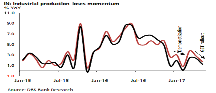 "We expect a 0.5 percent y/y drop, from 1.7 percent month before. This could take Q2 2017 IP to 1.5 percent, from Q1’s 2.5 percent," DBS Bank commented in its latest research report.