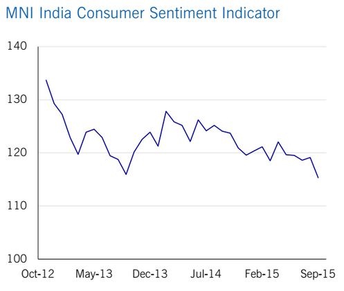 Naturally, MNI India Consumer Sentiment Indicator fell 3.2% last month to 115.3, lowest since the survey launched in November 2012.