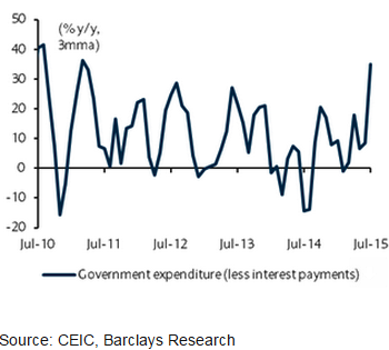 "Indeed, as part of its first supplementary demand for grants, the government effectively raised its FY 15-16 spending plans INR400bn (0.32% of GDP). In India, Feeling the fiscal force, the government could spend an additional INR1trn over and above its planned expenditures of INR17.8trn during FY 15-16 without posing any threat to its fiscal deficit target of 3.9% of GDP", says Barclays.