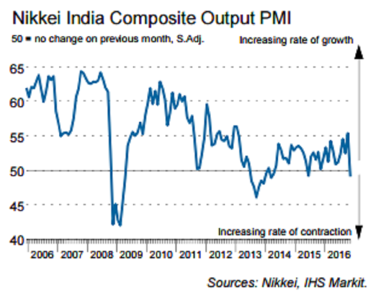 Although the scarcity of rupee notes also weighed on manufacturing performance, new order growth was sustained. The rise was, however, insufficient to offset the downturn in services and new business across the private sector as a whole decreased slightly.