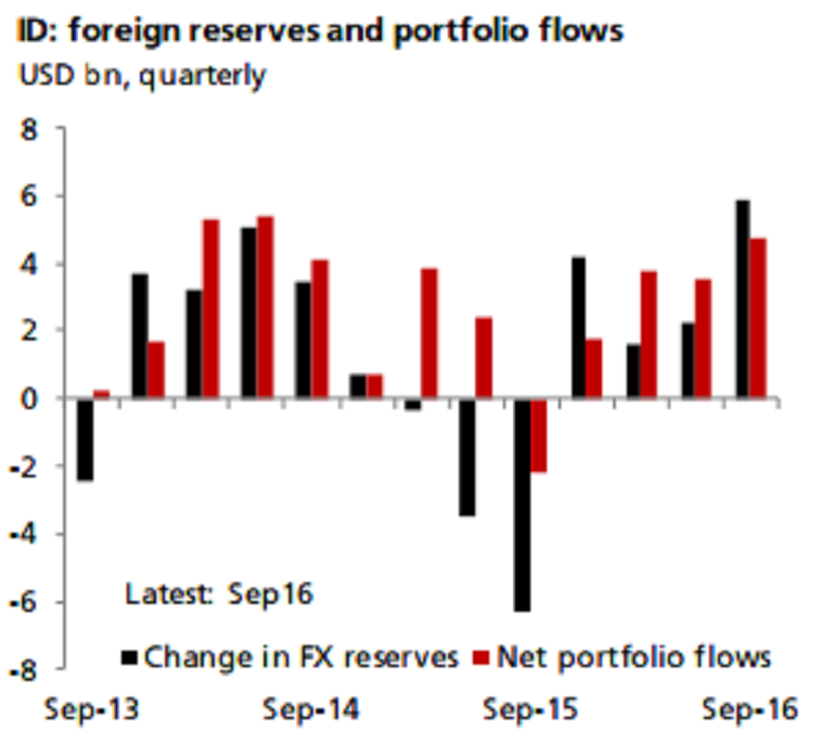 Foreign reserves in Indonesia surged to more than a four-year high during the month of September s having risen by close to USD10 billion. This is equal to about 80 percent of total foreign inflows recorded in equities and Indonesian government bonds.